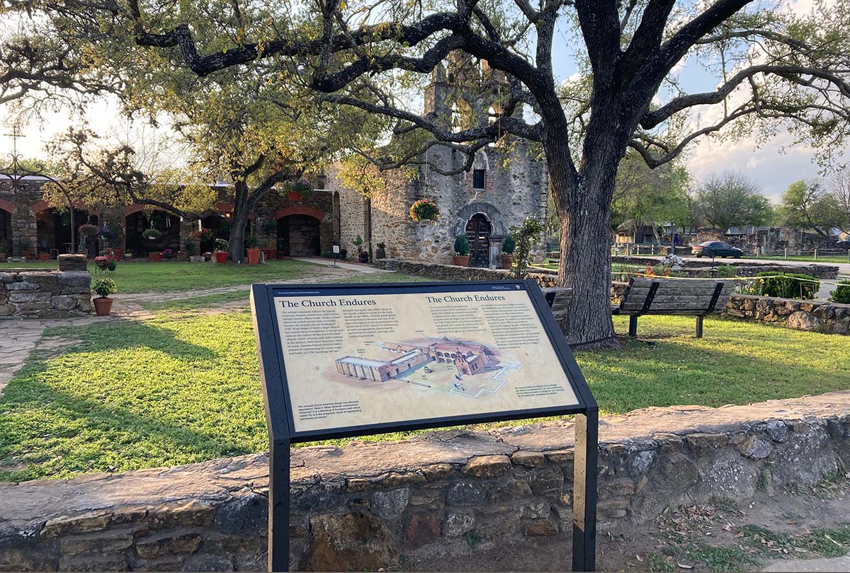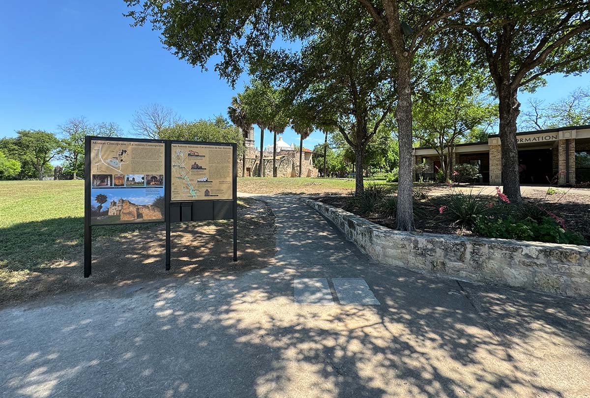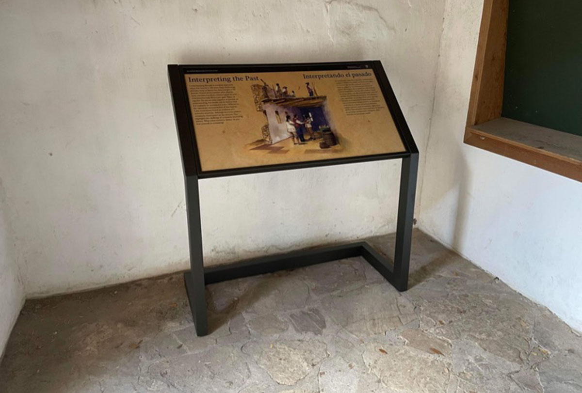 Along with managing the project, Pannier also served as the fabricator of the Fiberglass Embedded panels and wayside exhibit bases. Cantilevered Exhibit Bases were used extensively throughout the missions to help visitors understand and learn what it was like to live there. Their low-profile presence on the landscape maintains the beauty of the architecture and surroundings while allowing for easy text reading. Each mission had an Upright or a Double Inline Exhibit at the entrance to prominently present important information about the area. Along with present-day photos and information, visitors can orient themselves with the help of an overview map of the mission. A custom arrangement of Brochure Holders adorns the bottom of the bases to allow park staff to distribute brochures and maps, along with more temporary information such as closures and events.
