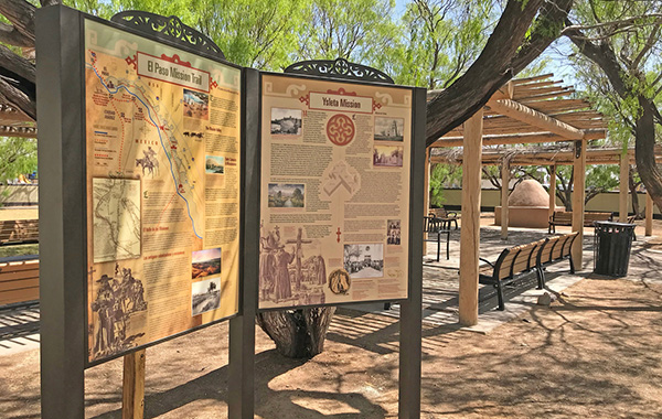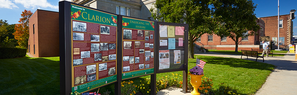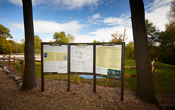 Offset bases connect multiple frames together at an angle, surrounding visitors with important information. Bulletin cases can also be integrated into these units.